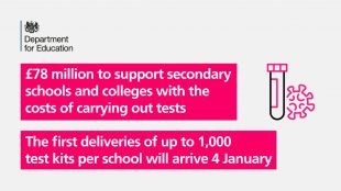 The first deliveries of up to 1000 starter test kits, with tests and PPE, will arrive at every secondary school and college on 4 January so that they are ready to go as soon as possible, with further replenishment deliveries throughout the week.